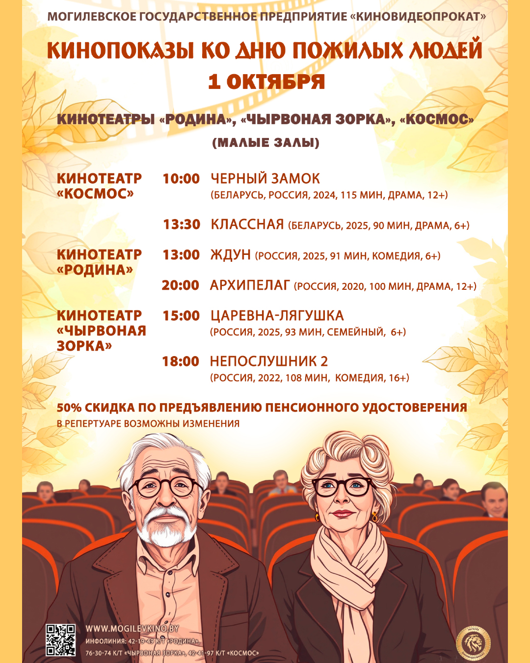 Могилевское государственное предприятие «Киновидеопрокат» поздравляет старшее поколение с Днем пожилых людей и приглашает 1 октября окунуться в мир кино, чтобы провести этот день в уютной атмосфере наших кинотеатров: «Родина», «Чырвоная Зорка» и «Космос».