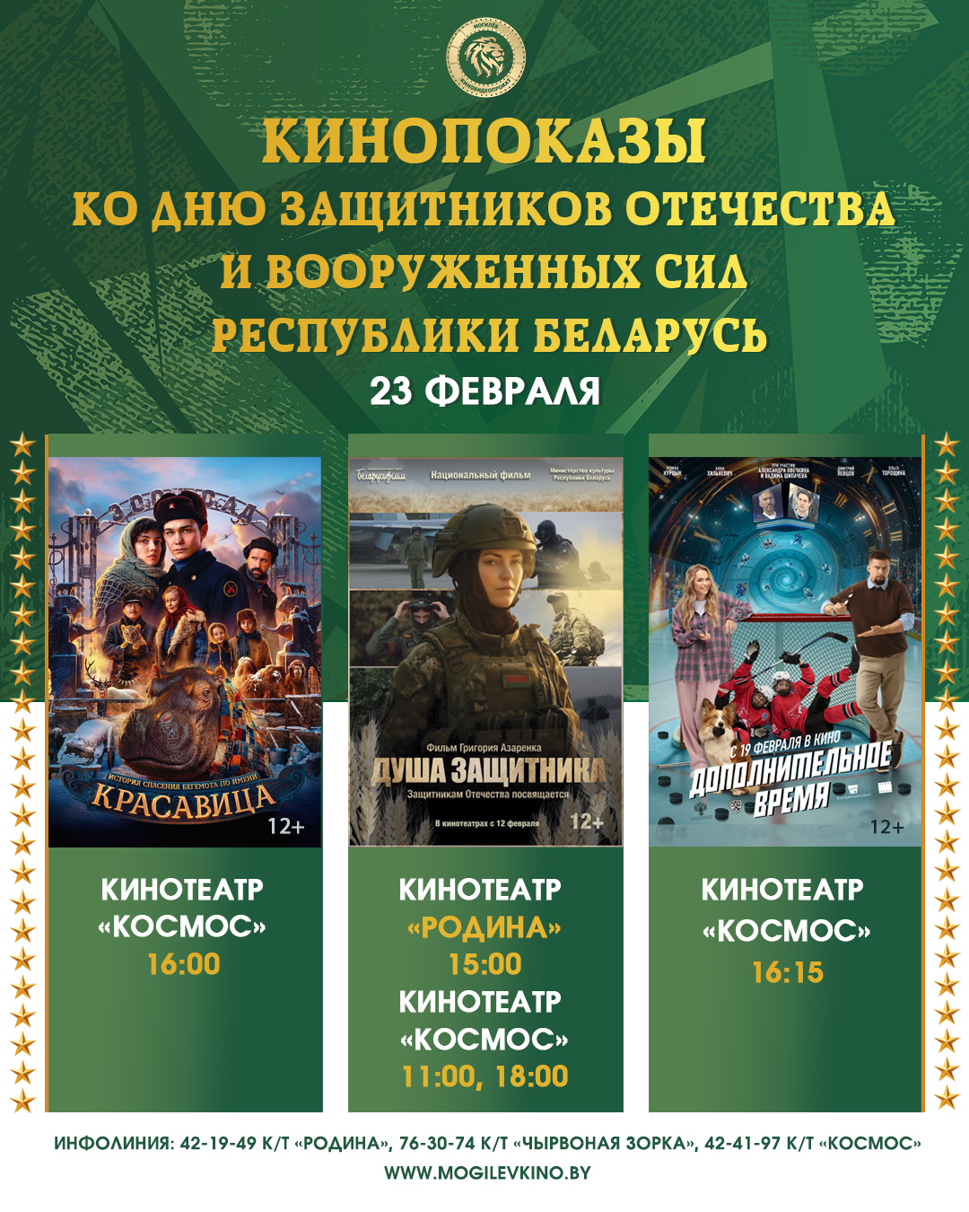 23 февраля кинотеатры «Родина», «Чырвоная Зорка», «Космос» Могилевского государственного предприятия «Киновидеопрокат» приглашают на кинопоказы ко Дню защитников Отечества и Вооруженных Сил Республики Беларусь.