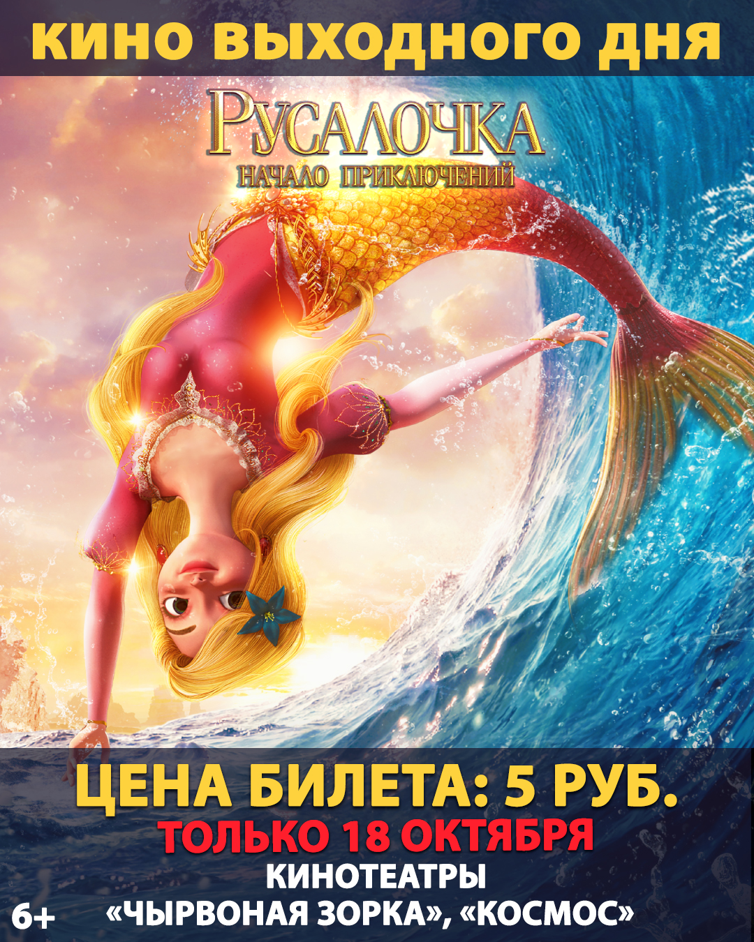 Только 18 октября в кинотеатрах «Космос», «Чырвоная Зорка» Могилевского государственного предприятия «Киновидеопрокат» всего за 5 рублей вас ждут приключения по загадочному подводному миру вместе с Русалочкой.