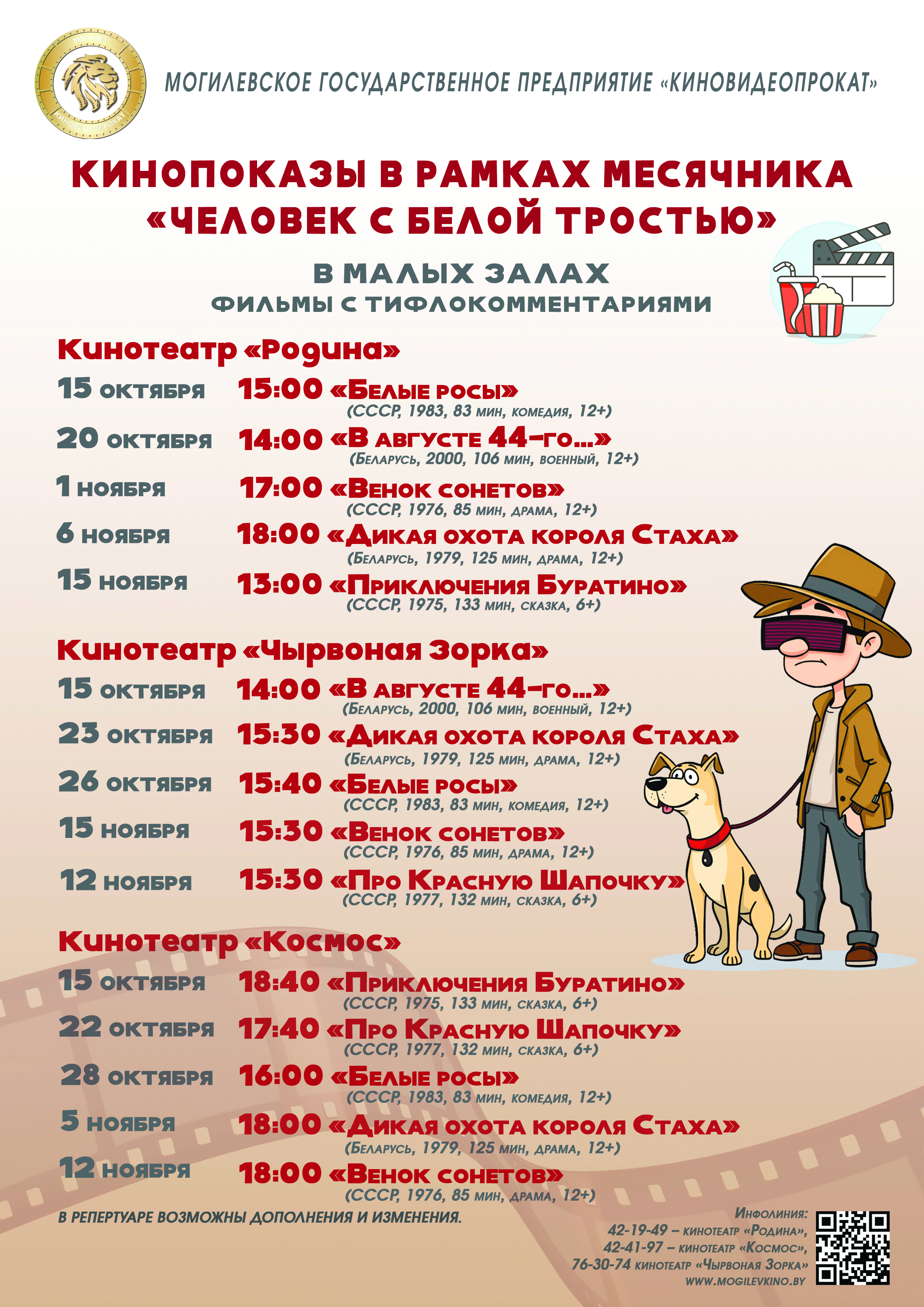 В рамках проведения месячника «Человек с белой тростью» кинотеатры «Родина», «Чырвоная Зорка», «Космос» Могилевского государственного предприятия «Киновидеопрокат» приглашают зрителей с ограниченными возможностями по зрению с 15 октября по 15 ноября на кинопоказы фильмов с тифлокомментированием (ТК).