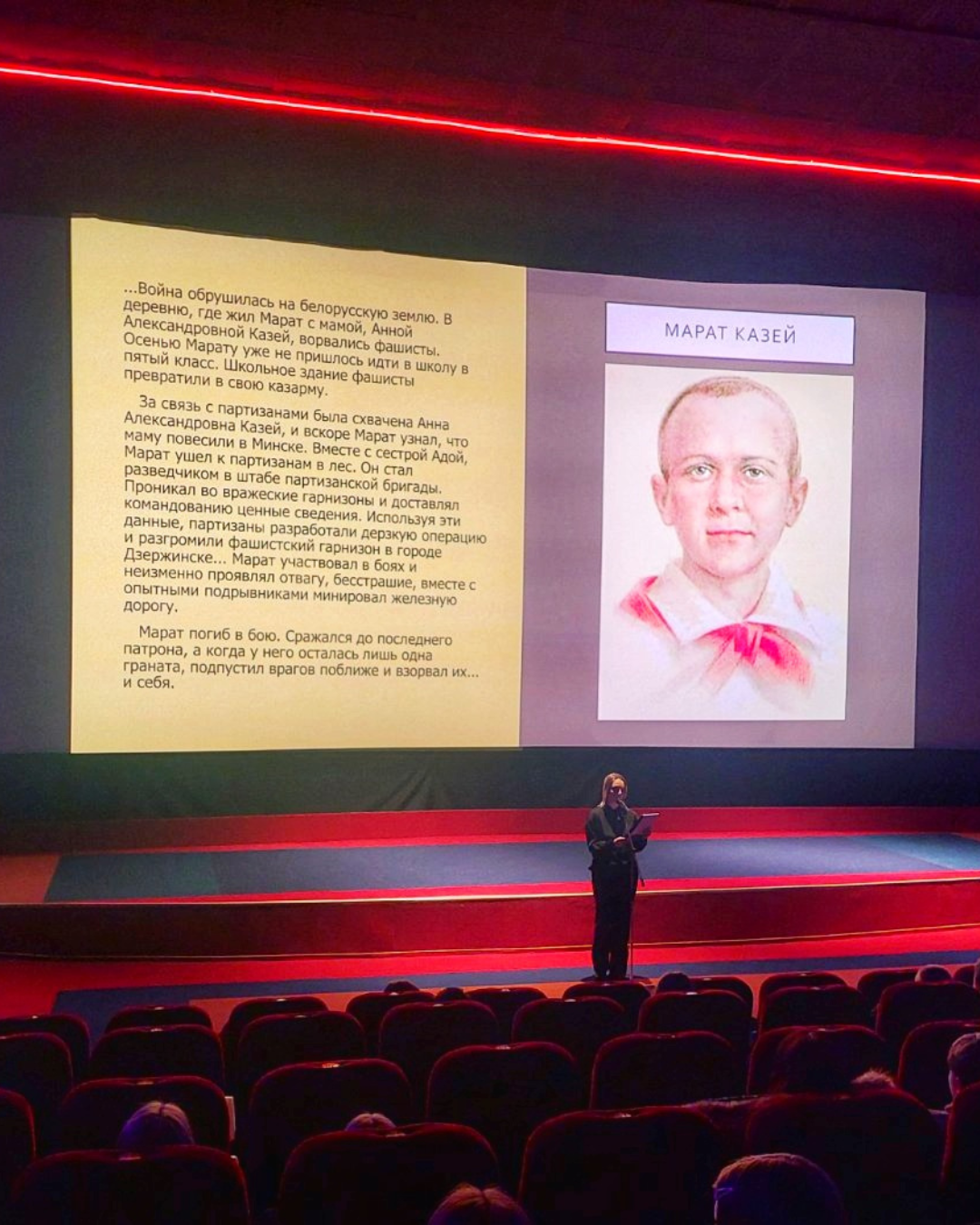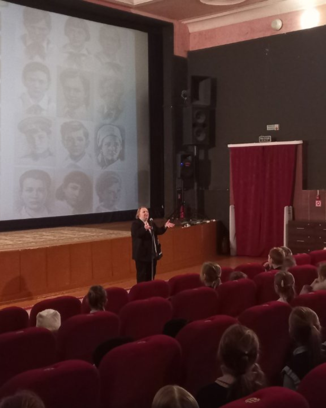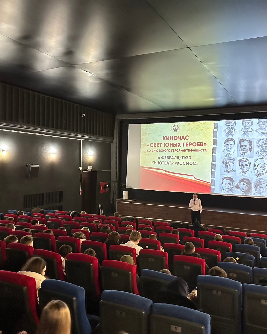 В кинотеатре «Космос» перед ребятами выступил Александр Васильевич Петухов, ведущий архивист учреждения «Государственныйархив Могилёвской области», магистр исторических наук.Он поделился фактами огероях, рассказал о сохранившихся архивных записях и исторических свидетельствах, которые помогают глубже понять подвиг юных антифашистов.