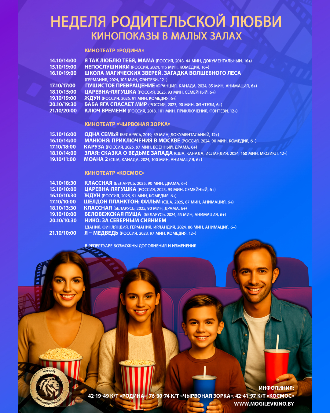 Могилевское государственное предприятие «Киновидеопрокат» приглашает с 14 по 21 октября в кинотеатры «Родина», «Чырвоная Зорка», «Космос» на кинопоказы, приуроченные к Неделе родительской любви.