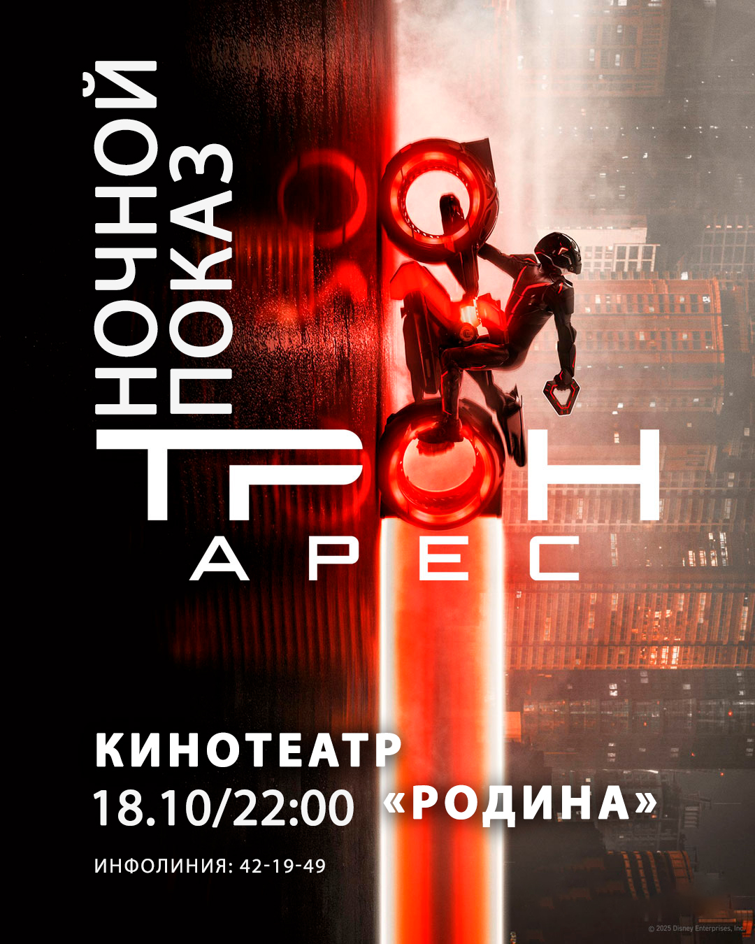 18 октября кинотеатр «Родина» Могилевского государственного предприятия «Киновидеопрокат» приглашает зрителей на НОЧНОЙ ПОКАЗ фильма «Трон: Арес» с неподражаемым Джаредом Лето, американским актёром и музыкантом, лидером группы Thirty Seconds to Mars, обладателем премии «Оскар».