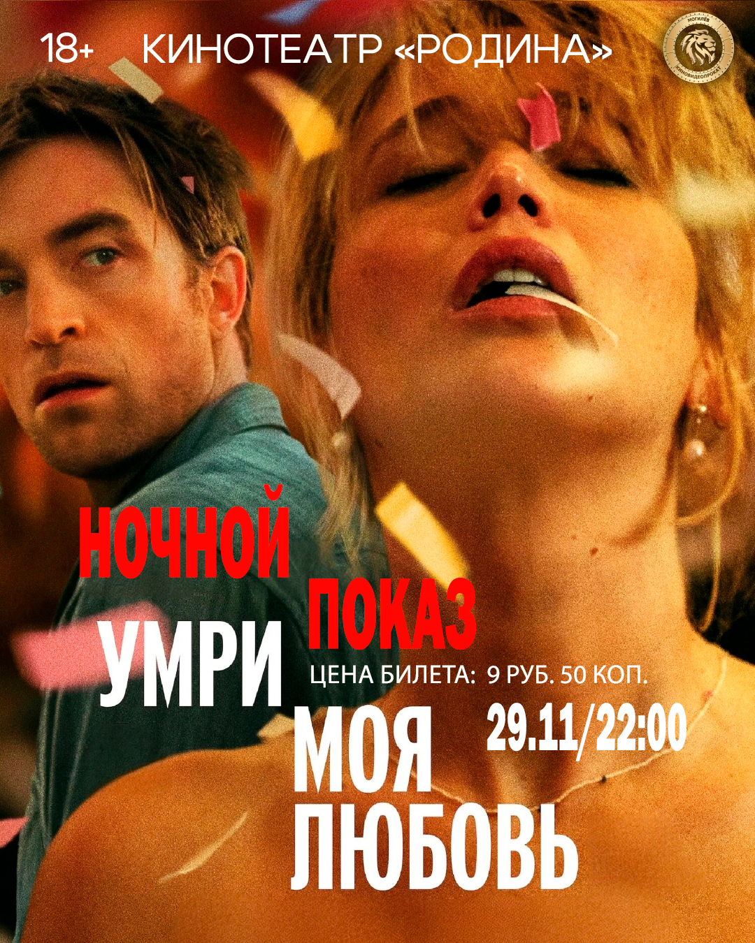 29 ноября в 22:00 в кинотеатре «Родина» вас ждет ночной показ фильма «Умри, моя любовь» с участием звездного дуэта – Дженнифер Лоуренс и Роберта Паттинсона.
