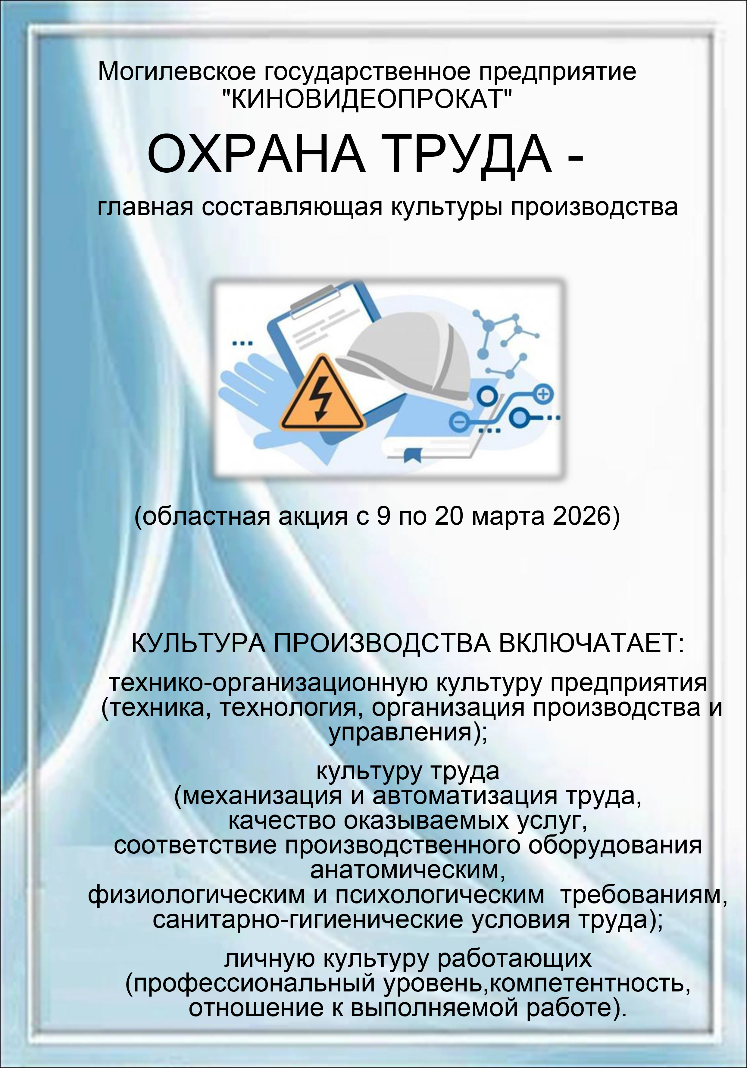 В соответствии с распоряжением Могилевского областного исполнительного комитета от 04.03.2026 №1-1-21/531 в целях повышения эффективности проводимой работы по профилактике и предупреждению травматизма, созданию здоровых и безопасных условий труда на Могилевском областном производственном унитарном предприятии «Киновидеопрокат» с 09 по 20 марта 2026 года проводится областная акция «Охрана труда – главная составляющая культуры производства». Целью данной акции является демонстрация приоритетности охраны труда в общей мисси и предприятия, а также повышение безопасности и качества организаци и производственного процесса, улучшения условий труда и профилактики травматизма.