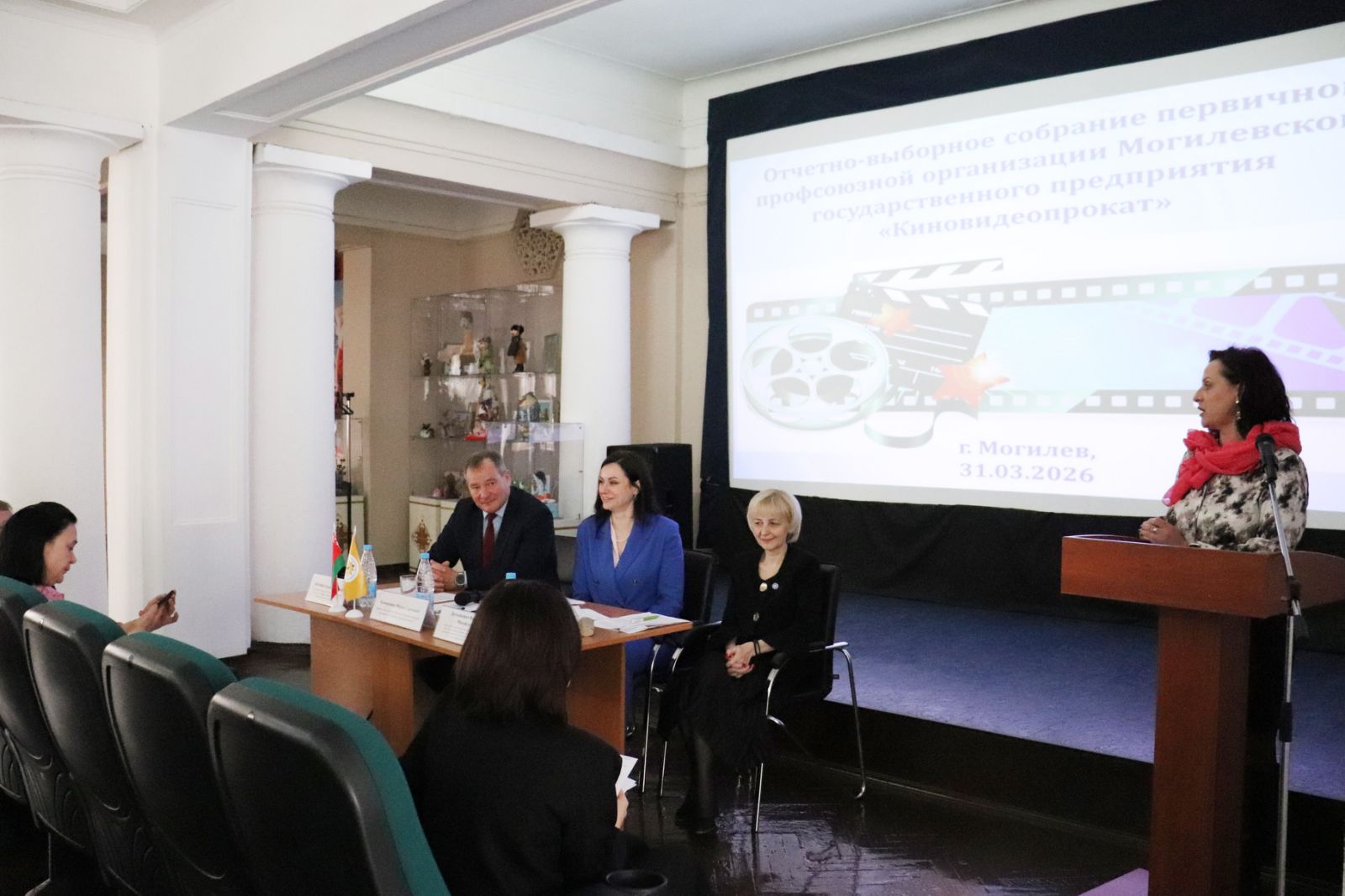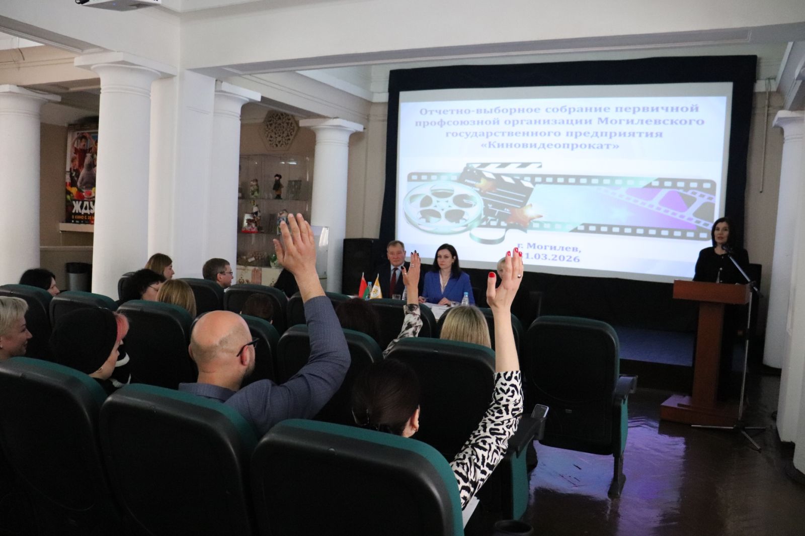 31 марта 2026 года в кинотеатре «Родина» состоялось отчетно-выборное собрание первичной профсоюзной организации Могилевского государственного предприятия «Киновидеопрокат» с участием председателя Могилевской областной организации Белорусского профсоюза работников культуры, информации, спорта и туризма Заблоцкого Андрея Борисовича, заведующего отделом организационной и общественной работы Могилевской областной организации Белорусского профсоюза работников культуры, информации, спорта и туризма Пятницкой Ирины Николаевны.
