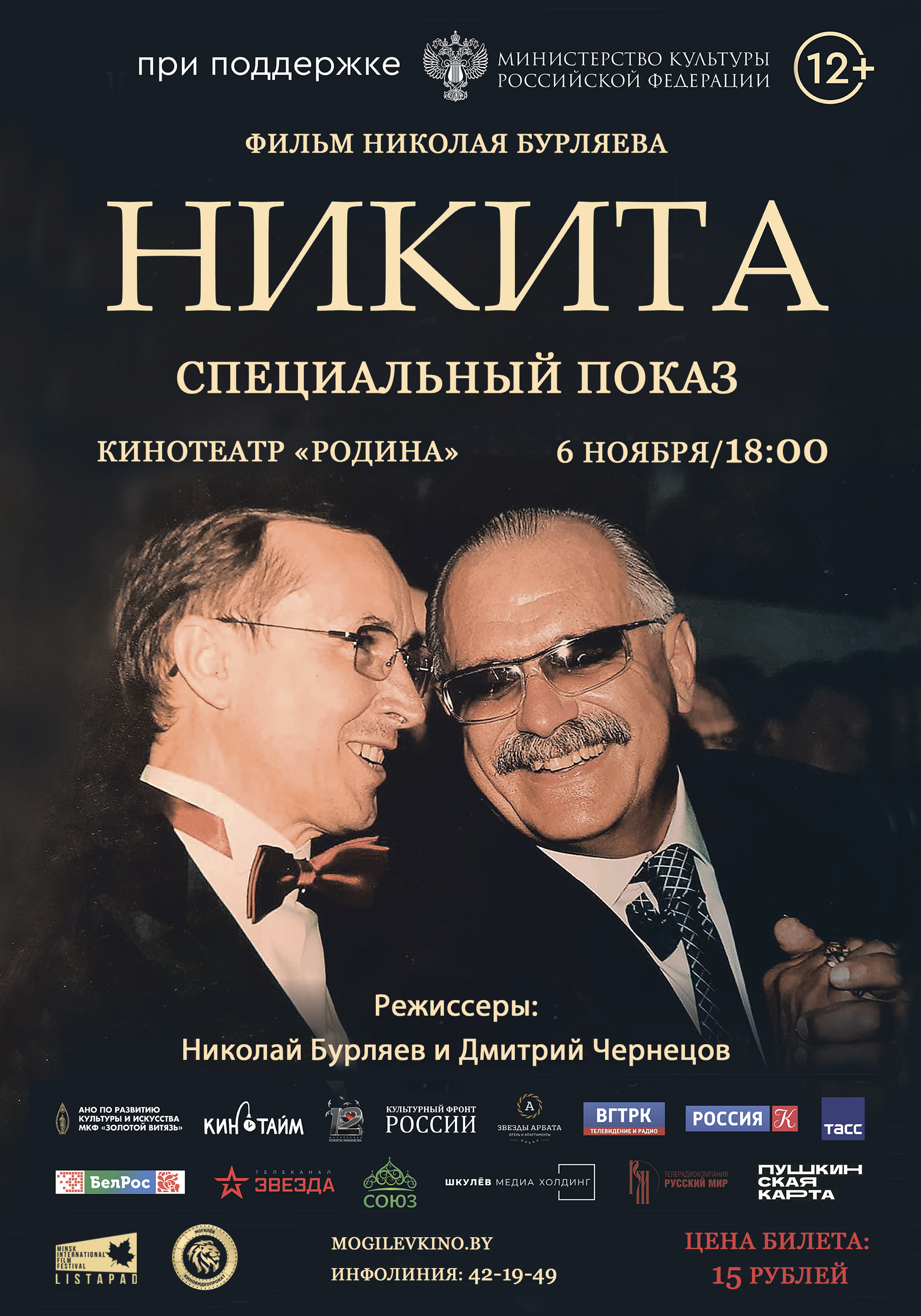 6 ноября 2025 года в 18:00 Могилевское государственное предприятие «Киновидеопрокат» приглашает в кинотеатр «Родина» на специальный показ фильма-посвящения великому русскому кинорежиссеру Никите Михалкову «Никита».