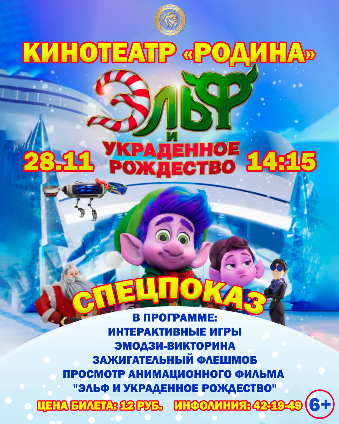 28 ноябряв 14:15 кинотеатр «Родина» Могилевского государственного предприятия «Киновидеопрокат» приглашает на спецпоказ семейного уютного мультфильма «ЭЛЬФ И УКРАДЕННОЕ РОЖДЕСТВО». Отправься на поиски духа Рождества вместе с эльфом Йойо.