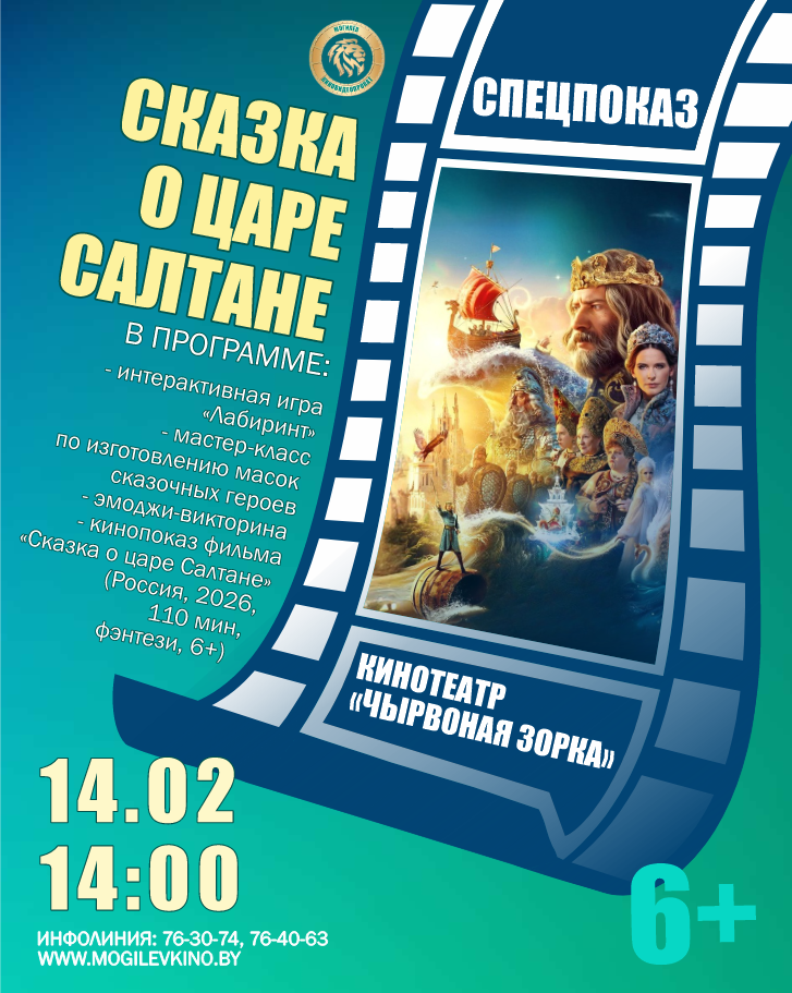 14 февраля в 14:00 приглашаем маленьких мечтателей и их родителей в кинотеатр «Чырвоная Зорка» на СПЕЦПОКАЗ нового фэнтези «Сказка о царе Салтане» (Россия, 2025, 110 мин., 6+).