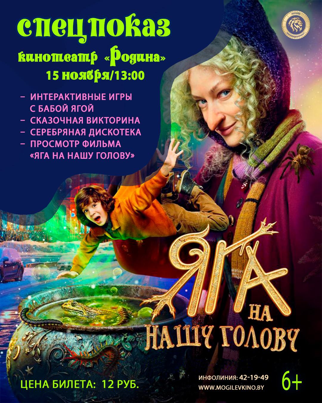 15 ноябряв 13:00 кинотеатр «Родина» Могилевского государственного предприятия «Киновидеопрокат» приглашает на спецпоказ семейного фильма «Яга на нашу голову». Это отличная возможность провести время с семьей и друзьями, насладиться сказочным сюжетом и яркими персонажами.