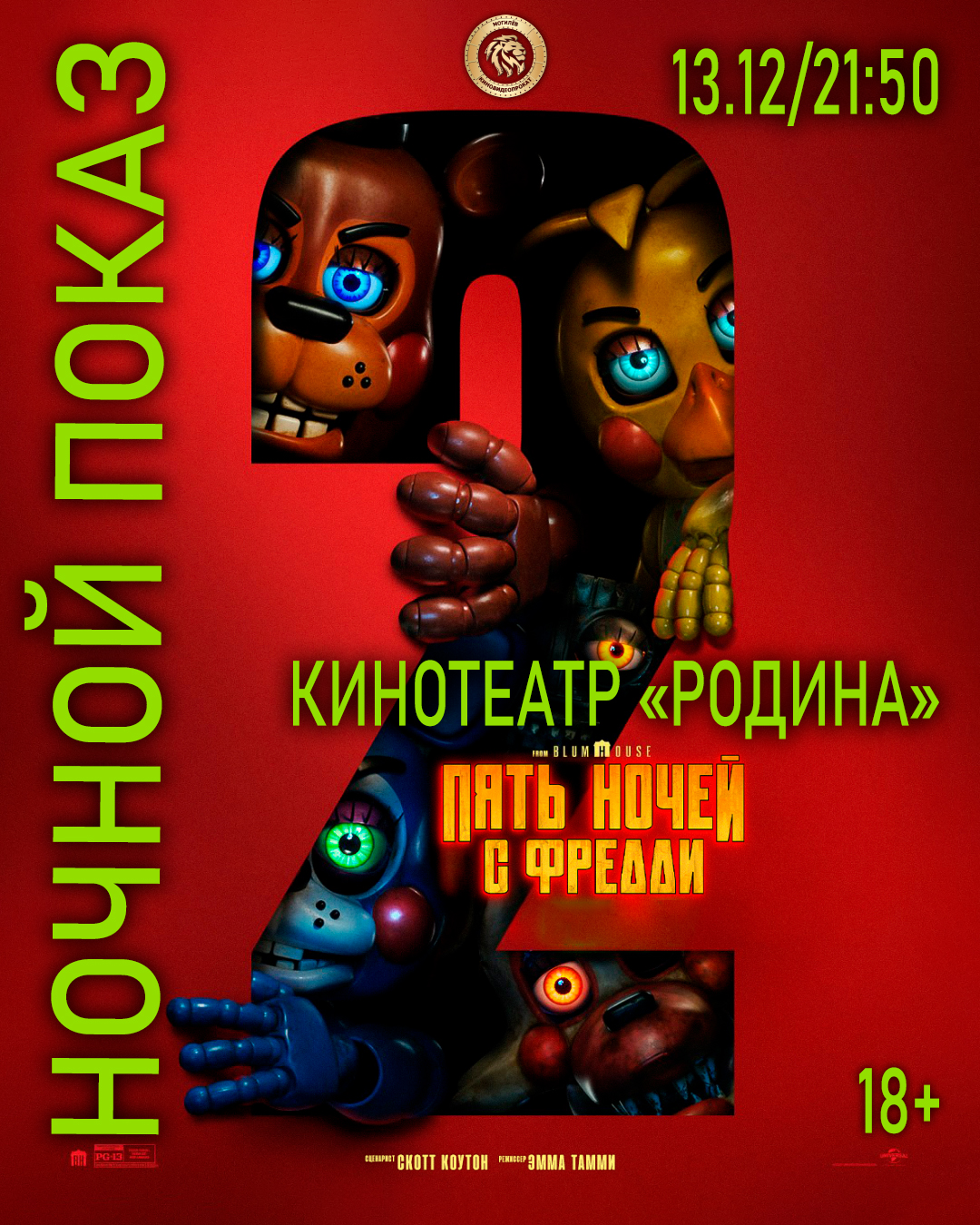 11 декабря кинотеатр «РОДИНА» вас ждет ночной показ фильма «Пять ночей с Фредди 2»