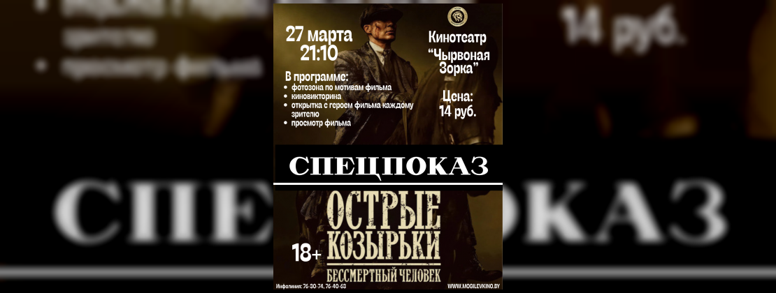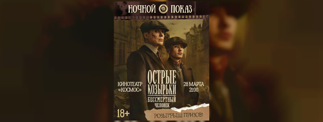 28 марта приглашаем в кинотеатр «Космос» на НОЧНОЙ ПОКАЗ фильма «Острые козырьки: Бессмертный человек». Вас ждёт захватывающий сюжет и розыгрыш призов.