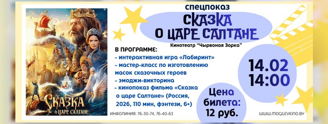 14 февраля в 14:00 приглашаем маленьких мечтателей и их родителей в кинотеатр «Чырвоная Зорка» на СПЕЦПОКАЗ нового фэнтези «Сказка о царе Салтане» (Россия, 2025, 110 мин., 6+).